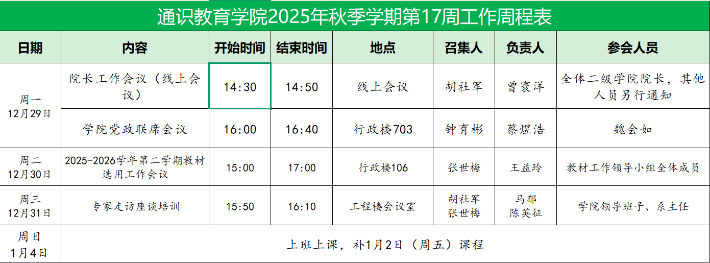 2025-2026学年第一学期太阳成集团tyc33455第17周工作表
