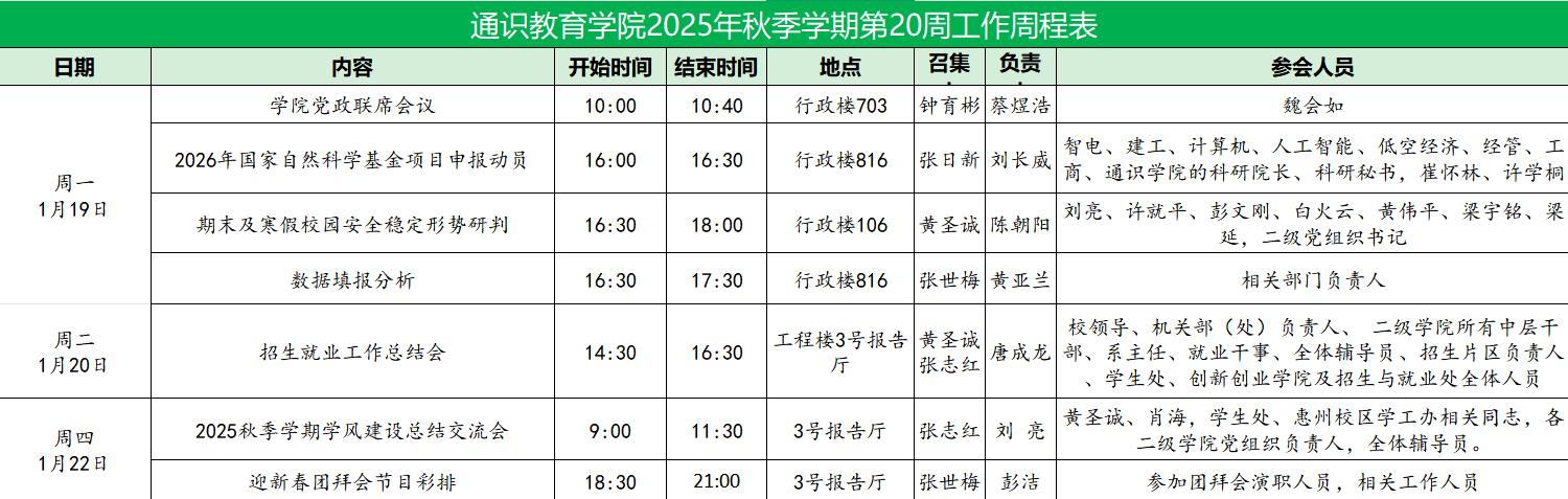 2025-2026学年第一学期太阳成集团tyc33455第20周工作表