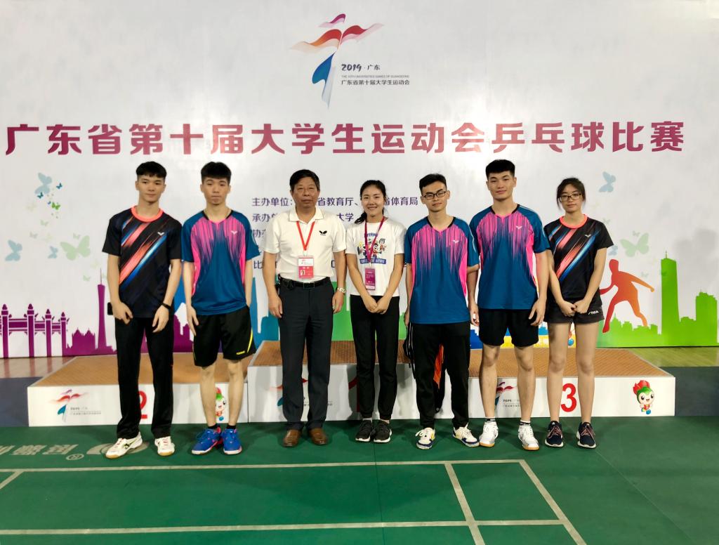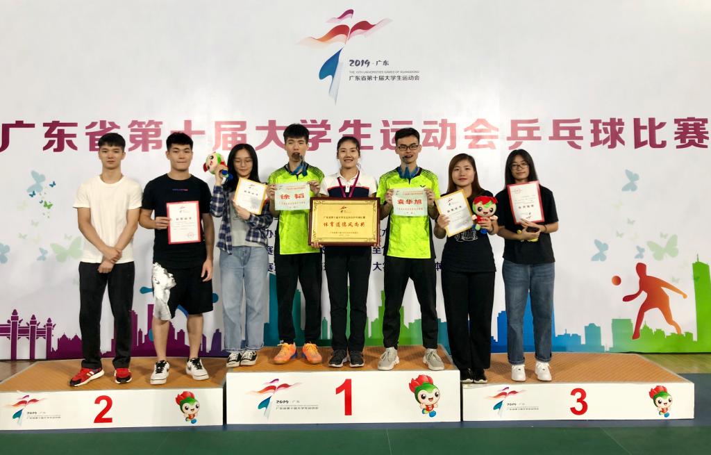 接下来与本次比赛的主场华南理工大学展开季军争夺战。虽然现场华工的啦啦队实力雄厚,但我们两名运动员凭借前面的比赛经验,上场立马拿下两局,以2:0领先。第三局时,因对手放手一搏,奋力拼杀,连追两局。决胜局时,我们运动员积极调整心态,抢先上手,气势十足,拿到4比0的比分开局,两名运动员一鼓作气,以11比6拿下了决胜局,最终以3:2战胜华南理工大学,获得本次大运会乒乓球甲组男双比赛的季军。