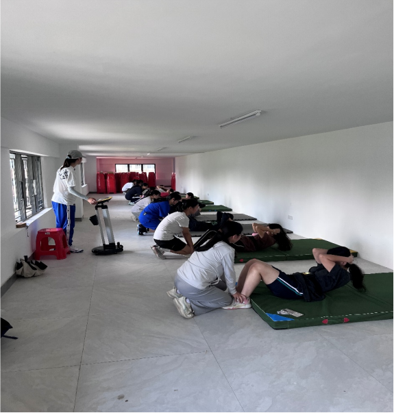 学生在老师的监督与指导下进行仰卧起坐测试