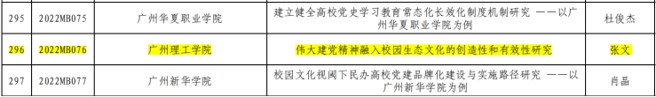 2月24日,在广东省高等学校党的建设研究会印发的《关于广东省高等学校党的建设研究会2022年党建研究课题立项的通知》文件中,马克思主义(通识教育)学院张文老师申报的课题《伟大建党精神融入校园生态文化的创造性和有效性研究》获批立项。