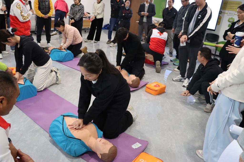 实操训练中,老师们热情高涨,积极参与模拟演练,在讲师的指导下,逐步掌握了CPR、海姆立克急救法的操作技巧。实操练习时,老师反复练习,互相指导,力求每个动作规范到位。
