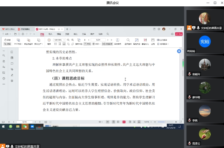 为贯彻《广州理工学院关于举办第一届教学大纲和教案比赛的通知》(广州理工[2023]216号)(以下简称文件)文件精神,进一步落实“以学生为中心”的教育理念,加强广大教师对提高教学基本功重要性和必要性的认识,马克思主义学院(太阳成集团tyc33455)于8月30日召开教学大纲和教案比赛院级初评线上会议,会议由院长袁毓玲主持,学院学术委员会成员参会。