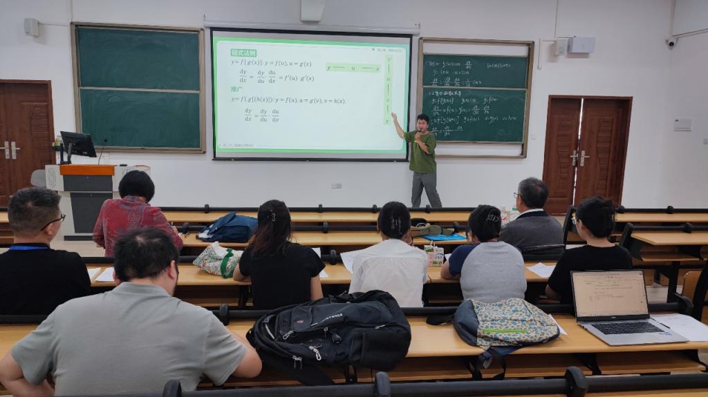 参与磨课的教师有欧年青、林雪和杨淮。欧年青老师磨课内容为“复合函数求导法则”。从复习基本初等函数求导法则入手,推导出复合函数求导法则,再小结出直观的链式法则,通过具体实例,演示了基本复合函数及抽象复合函数的求导。整节课层次分明,循序渐进,确保了学生能够逐步消化和理解知识点。林雪老师磨课内容为“函数的微分”。通过引例——正方形金属薄片受热后面积变化问题,从表达式函数增量在自变量发生微小改变时的近似计算问题,引出微分的定义,随后对函数微分的定义、函数可微与可导之间的关系以及微分的几何意义进行了清晰细致的讲解。林老师对引例讲解透彻,注意了图形与式子的比较,强调了线性主部的重要性,使微分概念的引入自然贴切,重点突出。杨淮老师磨课内容为“复合函数的连续性”。通过严谨的证明,深入阐述了复合函数连续性的理论基础,引出复合函数极限的运算法则,随后结合具体例题,展示了如何运用法则求极限。整节课思路清晰、直观,教态自然。