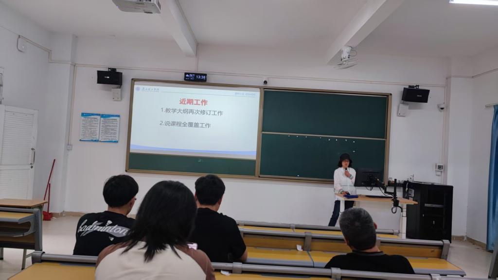 在教研活动中,卢教授首先对近期的教学工作进行了详细汇报。卢教授提到教学大纲的再次修订工作正在有序进行中,各课程团队正积极完善教学内容和目标,以适应新时代教育发展的需求。同时,说课程全覆盖工作也在稳步推进,为学生提供了更全面、深入的课程内容。