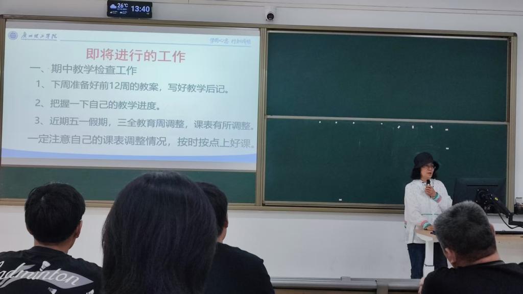 在汇报即将结束时,卢教授对即将开展的期中教学检查工作进行了部署。她提醒各位教师下周准备好前12周的教案,并撰写教学后记,同时注意把握教学进度。她还特别提到,近期因五一假期和三全教育周的调整,课表有所变动,各位教师需密切关注课表调整情况,确保按时按点完成教学任务。